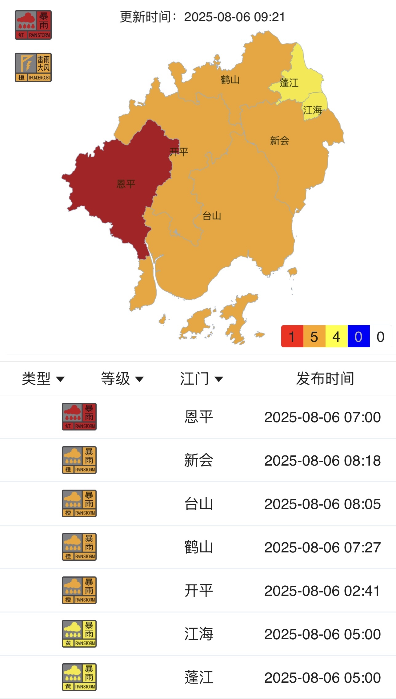 受加强的雷雨云团影响,目前江门全市暴雨预警信号生效。其中,恩平为红色,新会、台山、鹤山、开平为橙色,蓬江、江海为黄色。